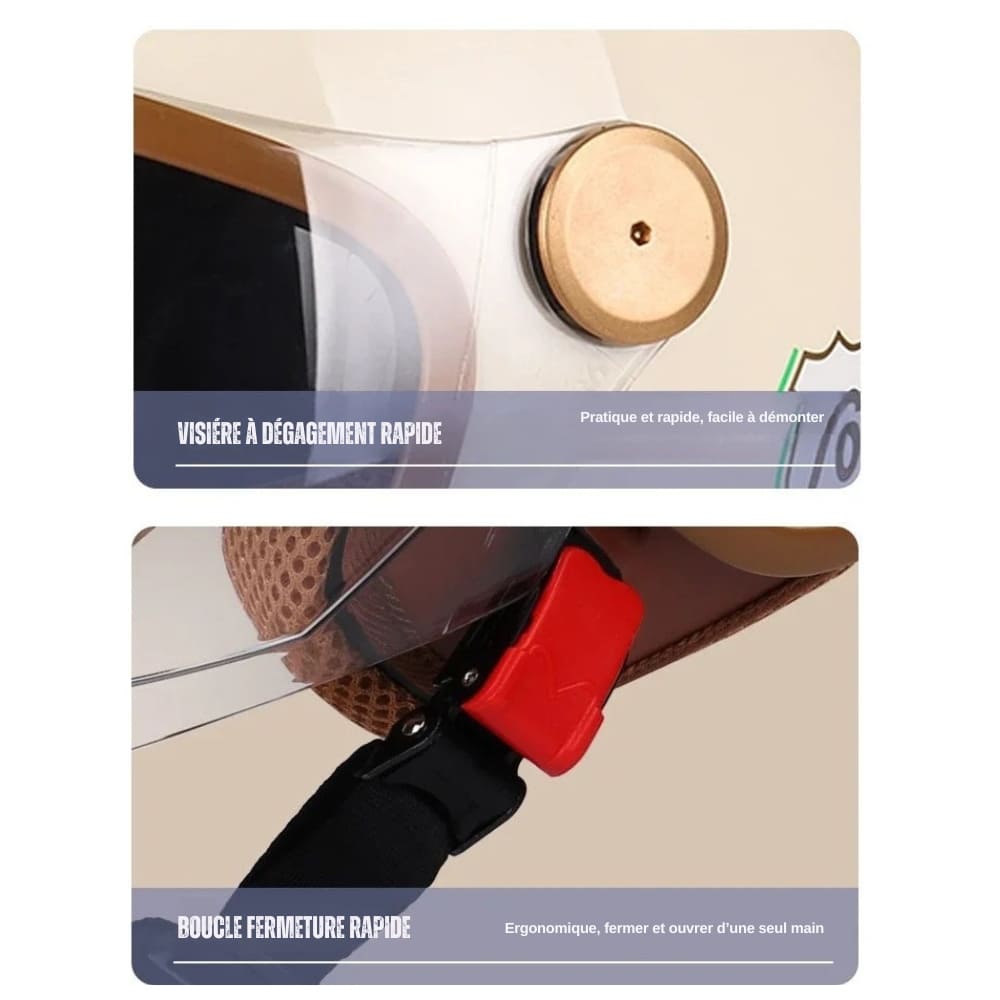 Découvrez notre Casques de moto Femme Retro Vintage "Angel Slump" | Open Face, est conçu pour les motards exigeant ! Sécurité, confort et style sont notre devise. Ce casque polyvalent offre une protection optimale grâce à sa coque en ABS homologuée DOT/ECE R 22.06. Son design modulable permet une adaptation facile a toute forme de tête, tandis que la visière solaire intégrée assure une visibilité parfaite en toutes conditions. L'intérieur démontable et lavable garantit une hygiène irréprochable, et les accessoires inclus, tels que la lentille anti-buée, les bandes réfléchissantes et la housse de protection, ajoutent une valeur supplémentaire. Roulez en toute confiance avec un casque qui allie performance et élégance.